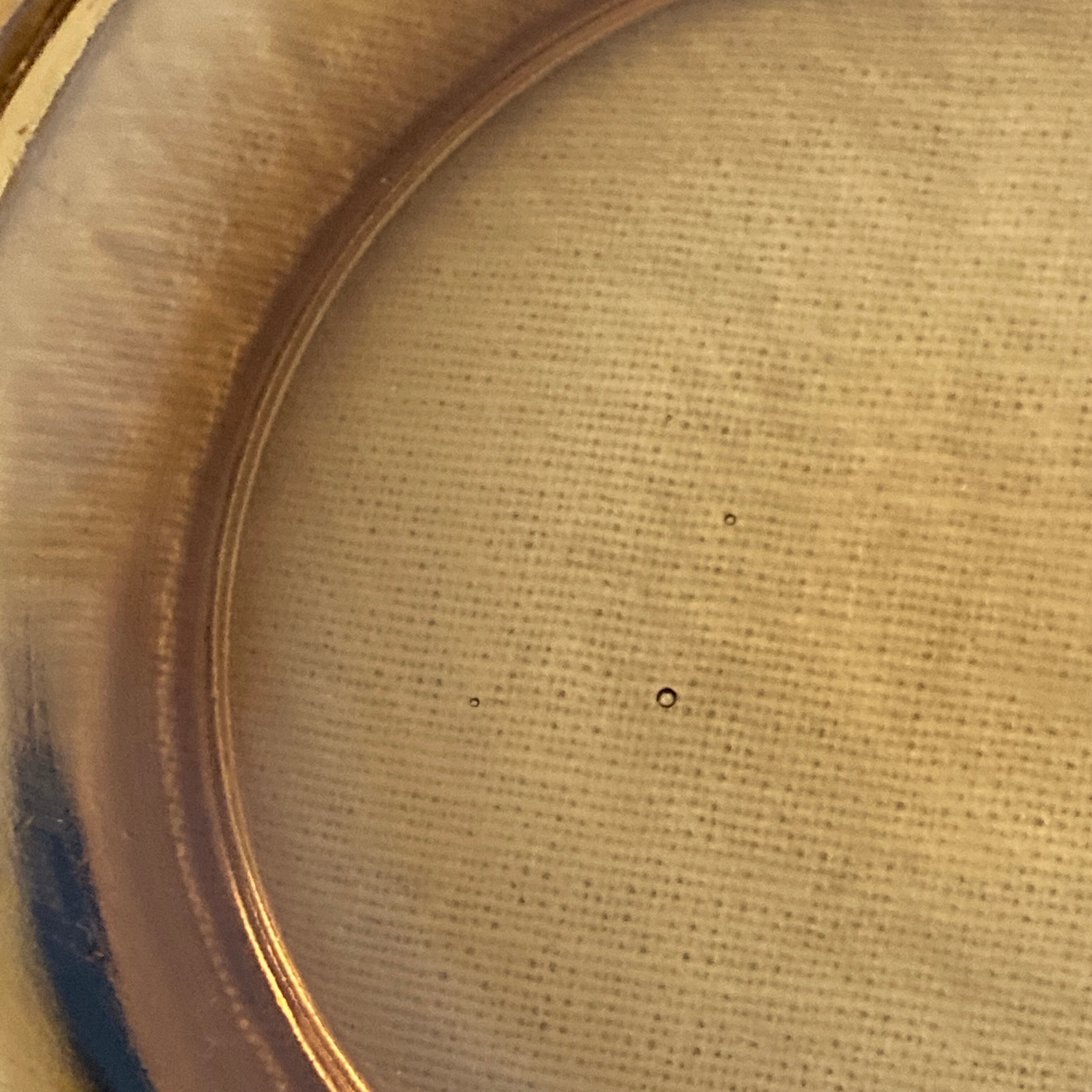裏側の角に欠け、製造過程による気泡も見られます。